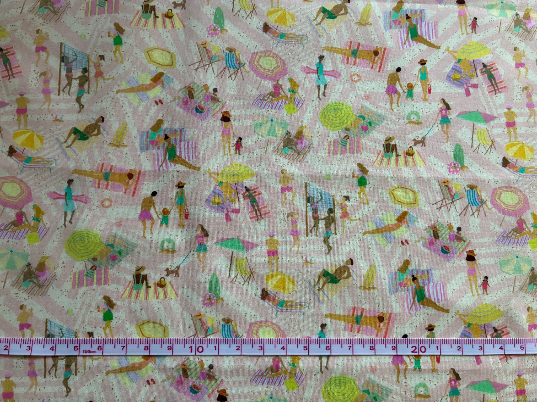リバティのスタジオで手描きされた、遊び心あふれるカンバセーショナル・パターン「ショアライン」。細部まで描き込まれた数々のモチーフが、見る人を物語の中へと誘います。グレイソン・ペリーのセラミック作品に見られる社会的な物語性や、ミクストメディアを自在に取り入れる表現手法から着想を得て、英国の海辺で過ごす夏の、のびやかで気ままな空気感を描き出しています。浜辺では、砂浜でくつろいだり、遊びに興じたり、本を読む人々の姿が点在し、背景に配された大胆なストライプが、現代的なエッジを加えています。幾何学的なコラージュ効果が、全体にさりげない奥行きをもたらしています。